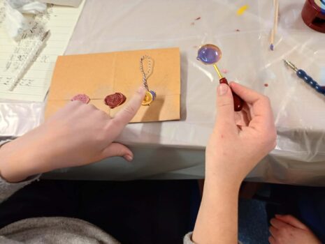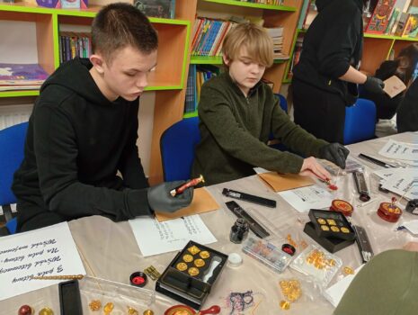 Uczniowie odkrywali, jak kiedyś tworzono eleganckie dokumenty, ćwiczyli kaligraficzne litery, a na koniec projektowali własne sfragistyczne symbole.
